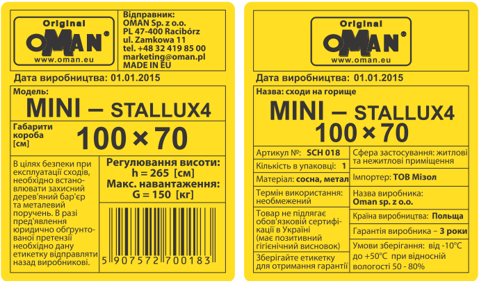 З 1 січня 2015 року компанія OMAN Sp z o.o. запроваджує додатковий захист проти контрабандної неякісної продукції, яку нелегально ввозять на територію України. Тепер офіційні горищні сходи ТМ «OMAN» позначені спеціальною наклейкою жовтого кольору (нижче приклад). Цей знак підтверджує постачання продукції на територію України законним шляхом, її високу якість та забезпечує гарантію від виробника.