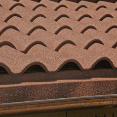 Поверхнева обробка натуральним кам'яним гранулятом надає черепиці природного зовнішнього вигляду і стійкості до пошкоджень і корозії. Гранулят у поєднанні із формою черепиці значно знижує шум дощу.