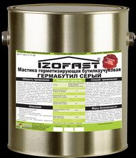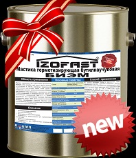 | Герметизація стиків бетонних залізобетонних та металевих конструкцій герметизації стиків та швів зовнішніх стін, що примикають балконних плит, віконних та балконних блоків у великопанельних будинках, теплицях. Верхній світловідбиваючий шар при покрівельних роботах для зовнішнього антикорозійного захисту конструкцій з листової сталі, труб для газо-, нафто- та водопроводів. | ![]() | Мастика Гермабутил IZOFAST (колір сірий, білий) | Витрата 1 кг/м. п.; наноситься при температурі від -40°С до +100°С |