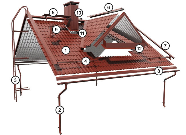Металева покрівля — це не тільки металочерепиця та профнастил. Покрівельний «пиріг» складається з внутрішніх конструкцій, системи водостоку, елементів безпеки покрівлі, планок та багатьох інших деталей та аксесуарів, наведених на малюнку нижче.