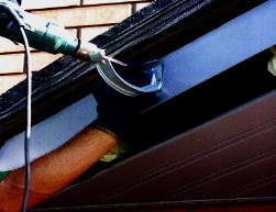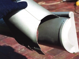 ![]() | 5. Встановлюємо водоприймач на випиляний ножівкою отвір. Загинаємо язички навколо країв ринви. Закріплюємо жолоб у призначених для нього гаках круглим краєм назовні. |