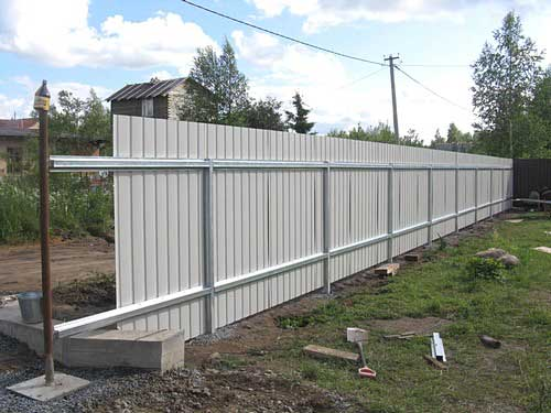 Підготовка. Для виготовлення паркану з профнастилу потрібно спочатку розмітити по периметру місця, де проходитиме огорожа. Потім по зазначеній прямій лінії необхідно встановлювати опори під огорожу. Це може бути труби або сталевий профіль. Відстань, на яку встановлюються стовпи, має бути в межах 2 — 2,5 метра. Виготовляти ями під опори можна за допомогою бура, що значно спростить роботу і на глибину 1 — 15 метрів, оскільки парусність огорожі велика. Кожну опору після встановлення необхідно забутувати та залити бетоном.