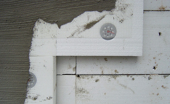 Утеплення стін будинку пінопластом потрібно починати з кріплення пінопласту у шаховому порядку. На пінопласт слід нанести клей та приклеїти до будинку. Після того, як пінопласт приклеєний, як правило, наступного дня його прибивають до будинку на грибки. Грибки потрібно закріплювати на стиках пінопласту, але використовувати не менше ніж п'ять штук на один квадратний лист. Після того, як пінопласт закріплений грибками, потрібно клеїти сітку на пінопласт на клею. Наносите клей на розмір сітки (ширина сітки дорівнює одному метру) і після того, як сітка буде приклеєна, потрібно знову нанести клей поверх сітки і зробити рівну поверхню для наступних шарів.