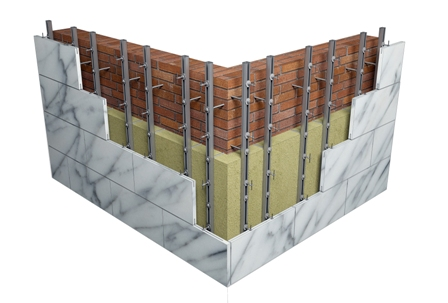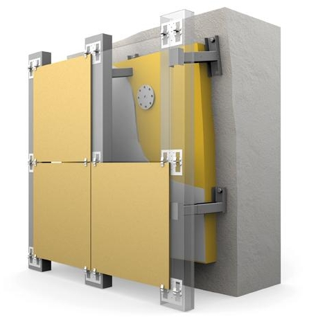 Вся система кріпиться до стін за допомогою алюмінієвих кронштейнів. Кронштейни укріплюються за допомогою фасадних анкерів. До кронштейнів кріпиться напрямний алюмінієвий профіль. Як утеплення застосовують мінеральну вату, що укладається до монтажу алюмінієвого профілю. Треба звернути увагу на те, щоб мати утеплювача щільно прилягали один до одного, не утворюючи порожнечі між собою. Кріпиться теплоізоляція у вентфасадах за допомогою зонтичних дюбелів. Утеплювач у навісних фасадах рекомендується вкривати вітровологозахисною мембраною. Причому вітробар'єр укладається між алюмінієвими профілями внахлест. Він захищає внутрішню конструкцію вентильованого фасаду від вивітрювання та намокання.