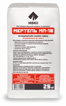 ![]() | МЕРТЕЛЬ МП-18 Готова суха термостійка суміш для кладки та ремонту камінів, печей (і інших споруд у яких присутній контакт з відкритим вогнем та розігрітими газами) з вогнетривкої цегли, бетону та природного каменю. Вогнетривкість — до 1600 °С. Виготовлена з вогнетривкої глини та шамотного порошку. Завдяки ідентичним фізико-хімічним властивостям ідеально підходить для кладки цегли ПБ-5. Суміш може бути використана для кладки та ремонту ділянок будівельних конструкцій, таких як: