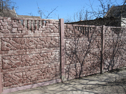 Кожен стовп встановлюється, фіксується, бетонується. Панелі потрібної текстури набираються між стовпами. Скомпоновану огорожу рекомендується обробити ґрунтовкою для бетону та пофарбувати фасадною фарбою. Забарвлена огорожа виглядає більш естетично і має підвищену стійкість до атмосферних впливів. Термін служби бетонних виробів — до 50 років.