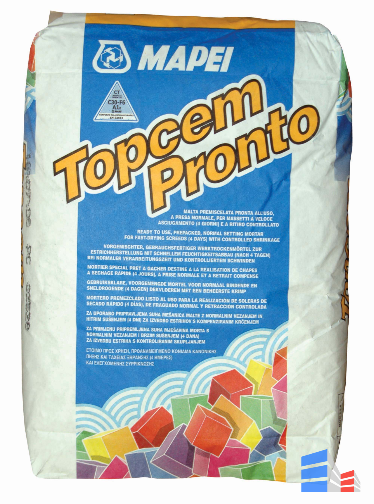 Технічні характеристики. Topcem Pronto — попередньо змішаний, готовий до використання склад з нормальним схоплюванням та контрольованою усадкою на основі спеціального гідравлічного в'яжучого та добірного заповнювача. Topcem Pronto легкий у використанні: просто змішайте з водою. Це запобігає помилкам, пов'язаним з додаванням правильної кількості в'яжучої речовини та заповнювачів, помилок, які могли б поставити під загрозу остаточні експлуатаційні характеристики стяжки після висихання. Topcem Pronto — ідеальне рішення, коли складно знайти фракційні заповнювачі хорошої якості, або на будівельних майданчиках, наприклад, у ділових центрах, де матеріально-технічне забезпечення, пов'язане зі змішуванням звичайних в'яжучих може бути утруднено. З Topcem Pronto можна працювати протягом такого ж відрізка часу, що і з розчинами на основі цементу, але час затвердіння набагато швидше.