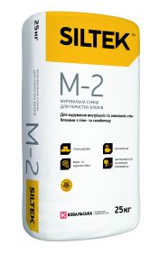 Застосування. Для кладки стін та перегородок із блоків водопоглинанням понад 10 % (газо- та пінобетон, ракушняк тощо) усередині та зовні будівель. Будівельна сумішSiltek М-2 ефективна для приклеювання теплоізоляційних блоків до цегляних та бетонних основ, а також для заповнення швів та стиків. Дозволяється використовувати суміш Siltek М-2 з позначкою "Зима" за середньодобової температури повітря не нижче -5 °С.