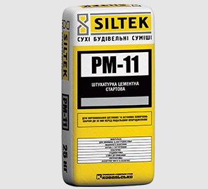 Застосування. Для вирівнювання поверхонь, що не деформуються (стін і стель) на основі цементного в'яжучого шаром до 30 (мм) всередині і зовні будівель перед подальшою обробкою (шпаклюванням, пристроєм теплоізоляції, обробкою декоративною штукатуркою, плиткою і т.п.). Рекомендується застосовувати суху будівельну суміш Siltek РМ-11 із використанням композиції Siltek Е-120 замість води для ремонту існуючих поверхонь та заповнення міжпанельних швів перед нанесенням основного шару штукатурки.