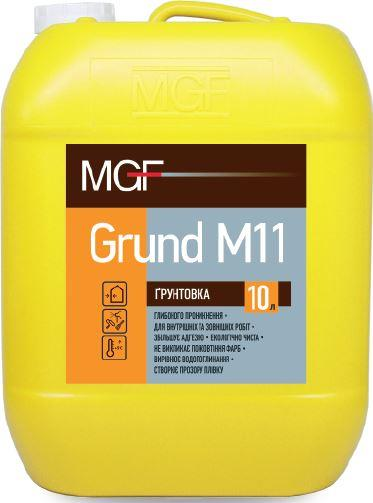 MGF Grunt M11 глибокопроникна ґрунтовка для внутрішніх та зовнішніх робіт — призначена для підготовки основи перед нанесенням лакофарбових покриттів та при виконанні будівельних робіт (нанесення штукатурки, шпаклівки, наклеювання шпалер, облицювання плиткою та влаштування підлог).