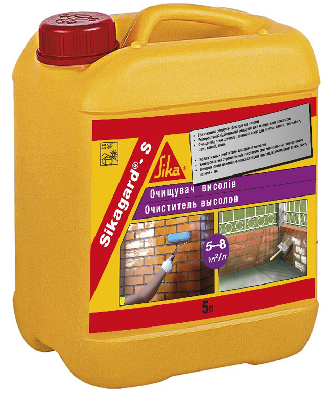 Sikagard S це кислотовмісний засіб для видалення висолів та очищення мінеральних поверхонь фасадів з цегли, природного каменю, керамічної плитки від плям розчину, цементу та інших забруднень.