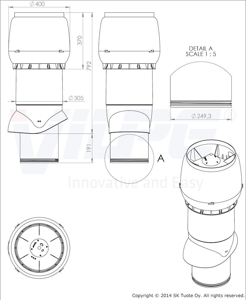 Вентиляційний вихід 250P/IS/700XL має трубу заввишки 700 (мм). Труба теплоізольована для запобігання утворенню конденсату в трубі. Внутрішня труба виготовлена із оцинкованої сталі. Довжина внутрішньої труби дозволяє вставити її в повітропровід, що підводиться, на довжину 300 (мм). Це полегшує вертикальний монтаж у тісних горищних приміщеннях і робить конструкцію міцнішою. Нижній край внутрішньої труби має гумовий ущільнювач, що герметизує з'єднання труби та повітроводу. Ковпак вентиляційного виходу захищає від потрапляння опадів та бруду до каналу.
