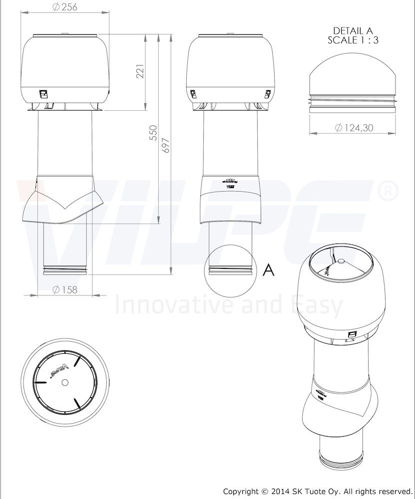 Вентиляційний вихід 125P/IS/500 має трубу заввишки 500 (мм). Труба теплоізольована для запобігання утворенню конденсату в трубі. Внутрішня труба виготовлена із оцинкованої сталі. Довжина внутрішньої труби дозволяє вставити її в повітропровід, що підводиться, на довжину 300 (мм). Це полегшує вертикальний монтаж у тісних горищних приміщеннях і робить конструкцію міцнішою. Нижній край внутрішньої труби має гумовий ущільнювач, що герметизує з'єднання труби та повітроводу. Ковпак вентиляційного виходу захищає від потрапляння опадів та бруду до каналу.