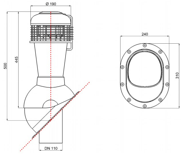 Покрівельне покриття: фальцева покрівля, профнастил; Тип вентилятору: з електровентилятором; Кут установки: 15 — 45 град; Розміри: D 150/H 500 (мм); Упаковка: 1 (шт./уп.); Матеріал та розміри упаковки: картон 50 x 26 x 38 (см); Місткість на європалеті 1,2х0,8 (м) заввишки 1,8 (м): 24 (шт.); Вага нетто: 2,40 (кг); Вага брутто: 3,10 (кг); Вбудований рівень WASSERWAAGE; Матеріал: PP — поліпропілен, пофарбований у масі, із захистом від УФ випромінювання.
