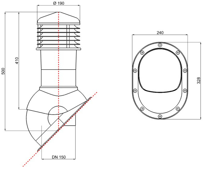 Вентиляційний вихід Normal Ø150 (мм) підходить для бітумних та профільованих металевих покрівель, встановлюється на вже існуючу черепицю та інші плоскі матеріали.