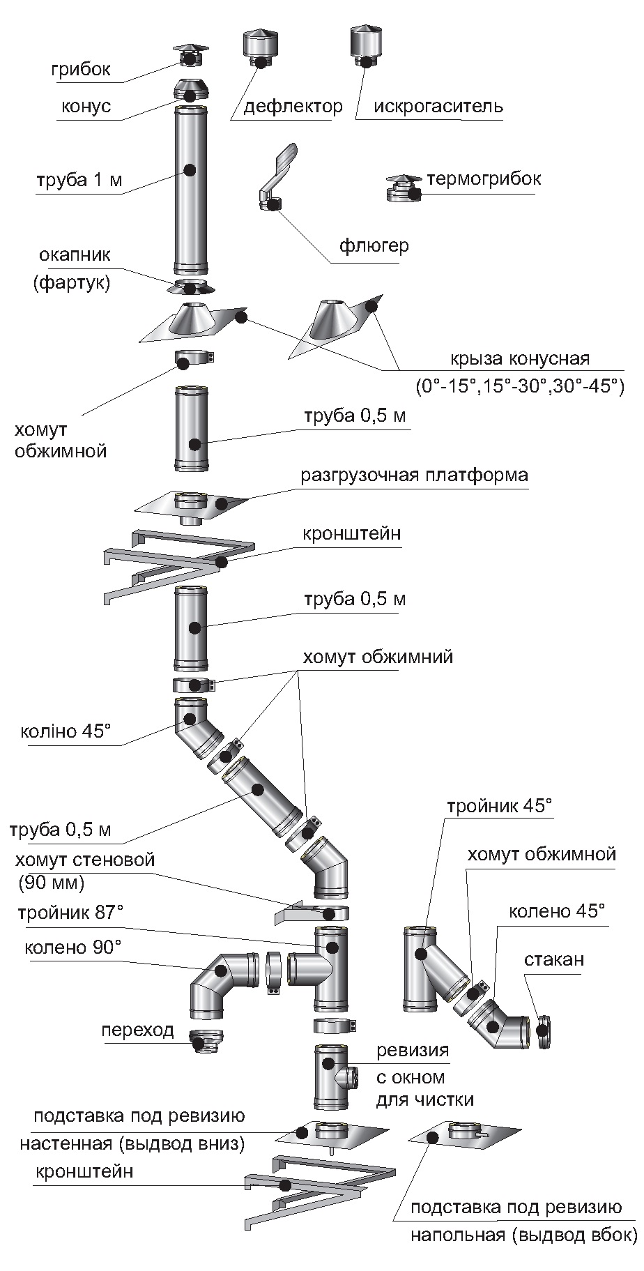 Призначений для з'єднання основних елементів з різними діаметрами та з'єднання з котлом.Для переходу використовується високоякісна оцинкована сталь. При виготовленні комплектуючих деталей застосовується плазмове зварювання у середовищі інертного газу (аргон).
