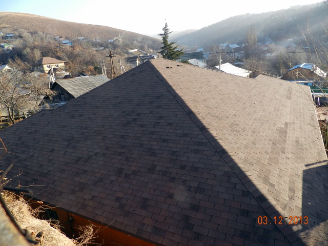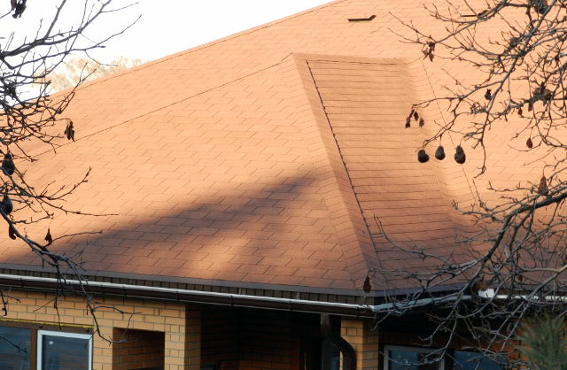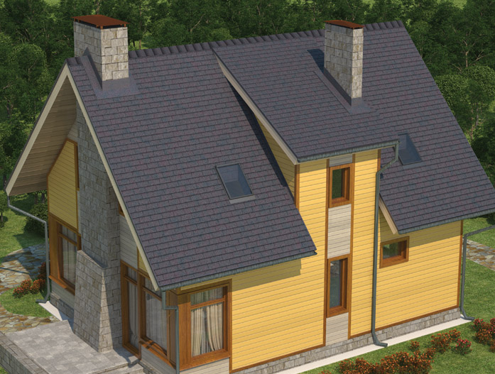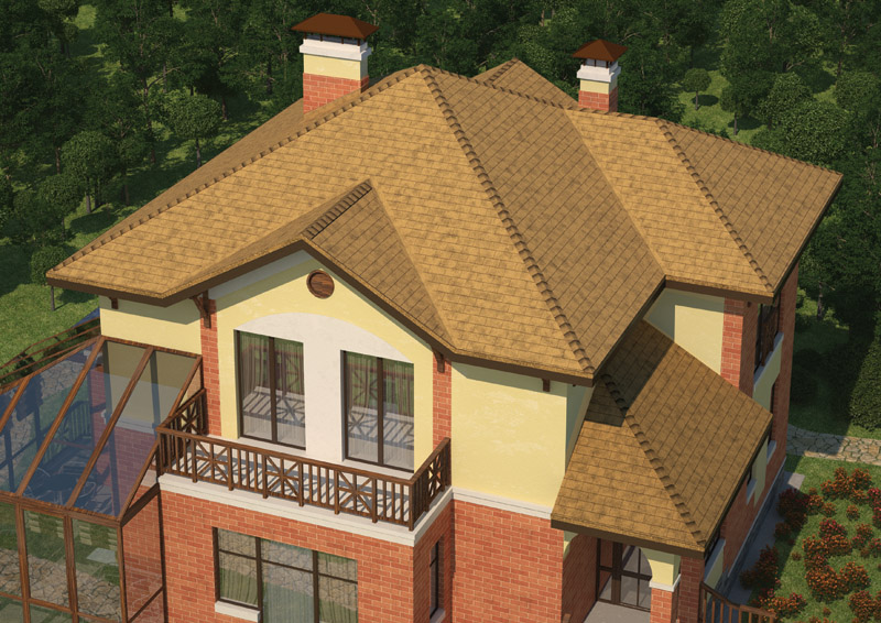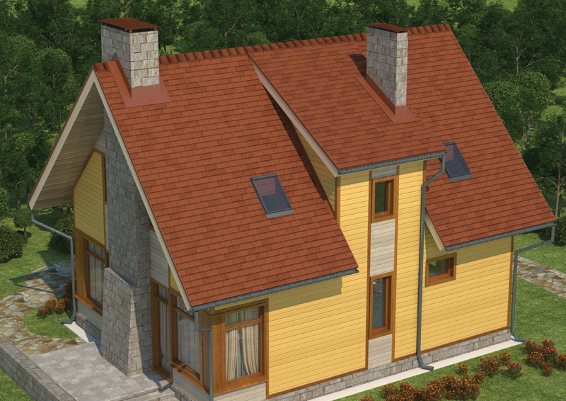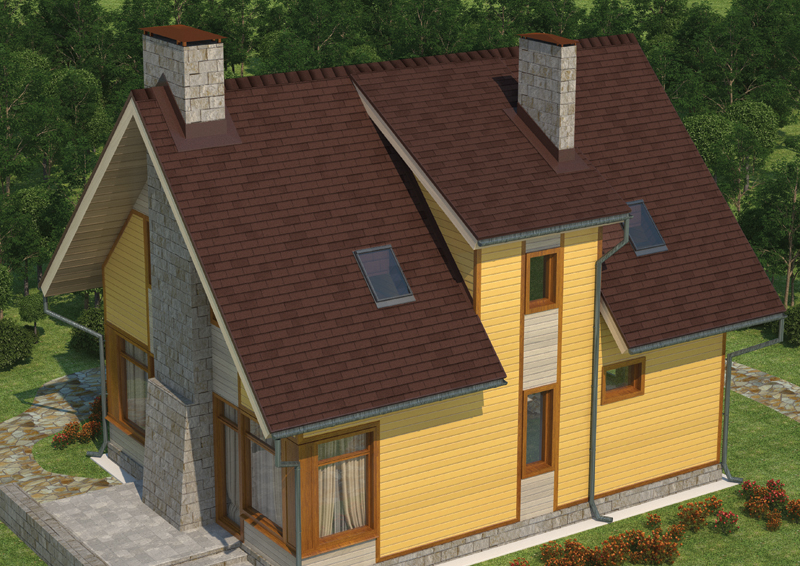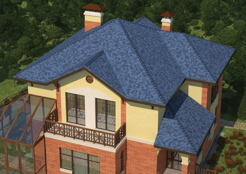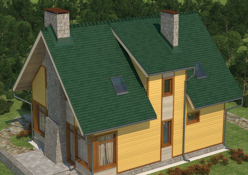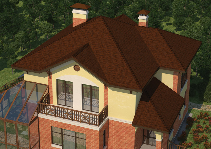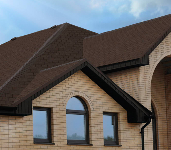 За счет трехлепестковых гонтов прямолинейной формы битумная черепица напоминает обычную кирпичную кладку. Такое оригинальное сочетание ярко выраженной прямолинейности с четкостью и изысканностью форм, а также классической расцветкой лучше всего гармонирует со зданиями, стены которых выполнены из кирпича или имитирующие такой стиль. Тогда все вместе сливается в единый образ добротного, элегантного и солидного строения.