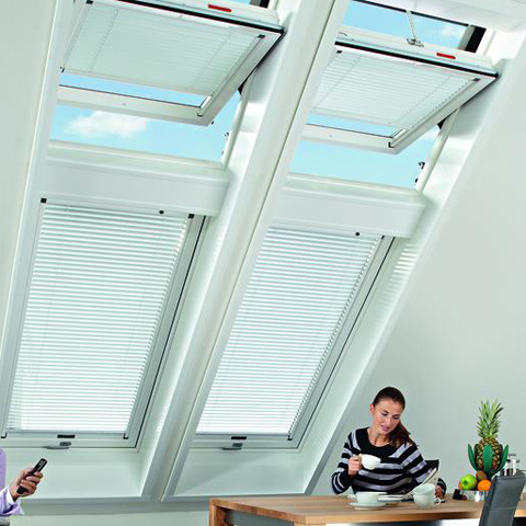 Мансардне вікно Designo R4 RotoTronic ідеально підходить для встановлення у важкодоступних місцях у поєднанні з вікнами Designo R7.