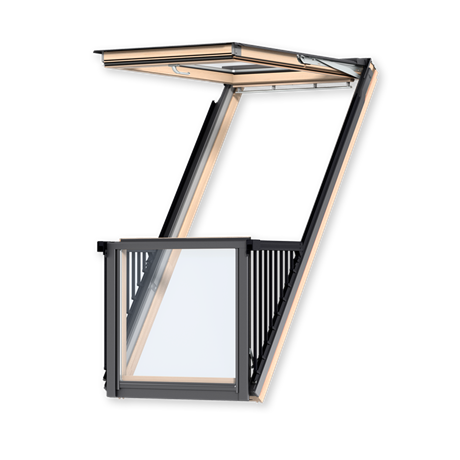 Velux cabrio — це інноваційне та практичне рішення для тих, хто хоче отримати вихід на природу прямо з мансарди. Покрівельне вікно перетворюється на балкон за лічені секунди. Підніміть верхню секцію, висуньте вперед нижню — і ось ви вийшли на балкон подихати свіжим повітрям і насолодитися видом.