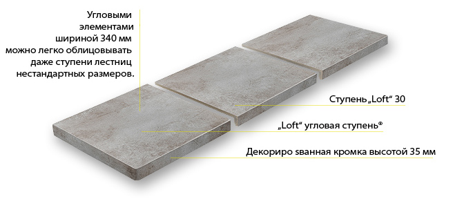 | 9331 Ступінь кутова, з флорентійським профілем 345х345х12 (мм) Колір: вся гама | 9430 "Loft" Ступінь рядова 294х340х35х11 (мм) Цвет: 705, 707, 717, 715 | 9441 "Loft" Ступінь кутова 340х340х35х11 (мм) Цвет: 705, 707, 717, 715 | 8108 Плінтус 294х73х8 (мм) Колір: вся гама | 9000 Кут під ступінь, зовнішній 157х60х60х11 (мм) Колір: вся гама |
