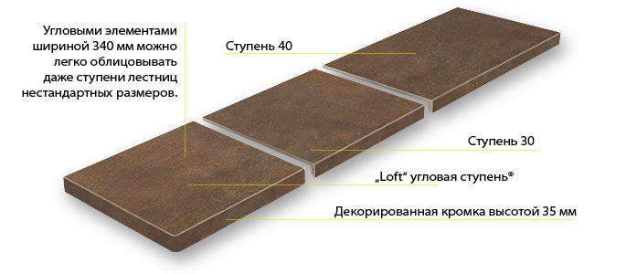 Відмінні риси елементів серії Asar. Флорентійський ступінь округляє кут. Але за допомогою нового, по-сучасному спрощеного ступеня Loftstufe тепер також можна підкреслити прямолінійність, а за допомогою повністю декорованого кута показати край, щоб створити атмосферу заміського будинку або «Loft Look». Продукція Stroeher дозволяє підібрати узгоджену комбінацію керамічних матеріалів не тільки для зовнішнього застосування, а й для приміщень.