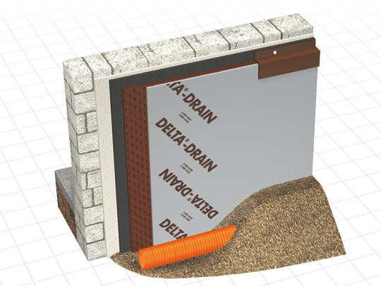 Відмінна особливість дренажної мембрани DELTA-DRAIN полягає в тому, що завдяки двосторонньому розташуванню виступів вона, з одного боку, створює вентиляційний прошарок навколо підземної стіни, а з іншого - відводить воду, що надходить з ґрунту, в дренажну систему. Повітряний прошарок між підземною стіною та матеріалом DELTA-DRAIN сприяє покращенню теплоізоляції підвалу, вирівнює тиск водяної пари та дозволяє висушувати стіну.