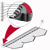 1. Клейка смуга (модифікований бітум); 2. Кольоровий гранулят; 3. Верхній шар бітуму (окислений); 4. Бітумізоване скляне волокно; 5. Нижній шар бітуму (окислений); 6а. Суцільний самоклеючий шар; 6b. Знімна плівка.