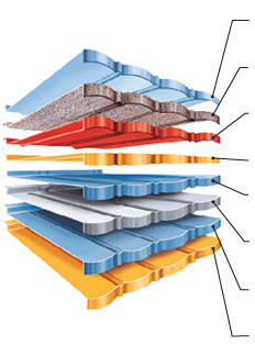 Прозрачная акриловая глазурь способствует самоочищению от пыли и грязи во время дождя Гранулят натурального камня придает внешний вид, защищает от механических повреждений, снижает шум дождя Акриловый слой Metrotile фиксирует гранулят на основе, хим. формула секретна Акриловая грунтовка дополнительная антикоррозионная защита Алюмоцинковый слой 185 г/кв.м. Антикоррозионная защита Galvalange 55% Алюминий, 43,4% Цинк, 1,6% Кремний Сталь – основа, обеспечивает прочность Алюмоцинковый слой 185 г/кв.м. Антикоррозионная защита Galvalange 55% Алюминий, 43,4% Цинк, 1,6% Кремний Акриловая грунтовка дополнительная антикоррозионная защита |