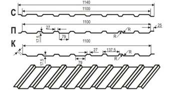 Висота профілю, (мм) Повна ширина листа, (мм) Корисна ширина листа, (мм) Довжина, (мм) Ширина кроку, (мм) Кріплення Товщина листа, (мм) Матеріал