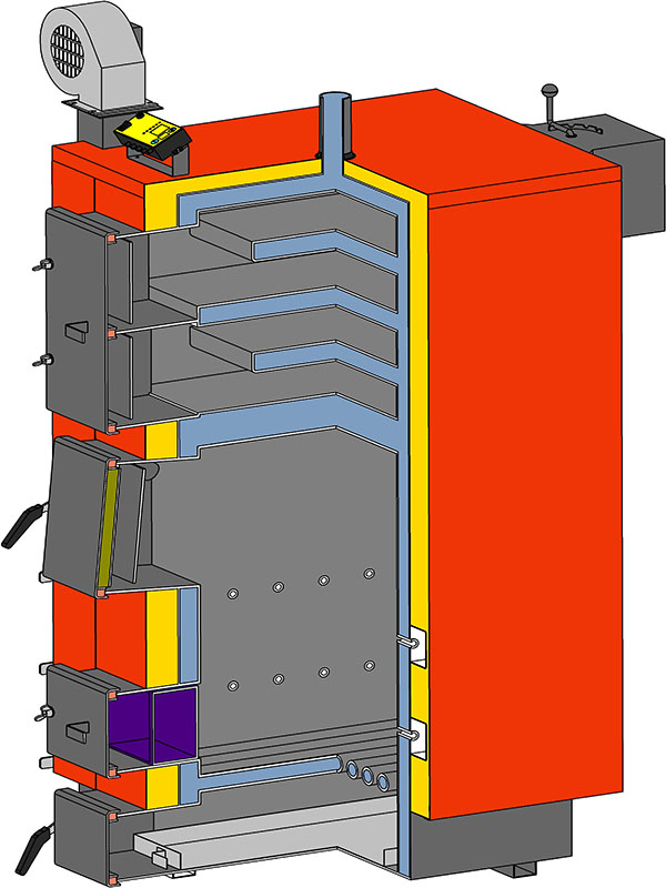 Котел опалення КТ-2Е — технічні особливості котла. Корпус твердопаливних котлів цієї серії має топкову камеру та теплообмінник, які виконані із сталі високої якості. Топка спроектована у формі чотиригранника, який також має аераційні сопла, а знизу має водяні колосникові грати, зроблену з товстостінних труб. Конвекційні канали в КТ-2Е розташувалися у верхній частині і мають форму декількох "полиць". Таке конструкційне рішення дозволило підвищити ККД казанів завдяки тому, що в конвекційній частині не накопичується конденсація. Передня частина котла увібрала ревізійні люки для очищення золи, вони, до речі, ще й полегшують доступ до конвекційних каналів. Також тут розташувалися топкові та завантажувальні дверцята, які оздоблені спеціальними термічними ущільнювачами на основі. Взагалі треба сказати, що котел на твердому паливі КТ-2Е оснащений високоякісною ізоляцією, яку захищає металевий кожух.
