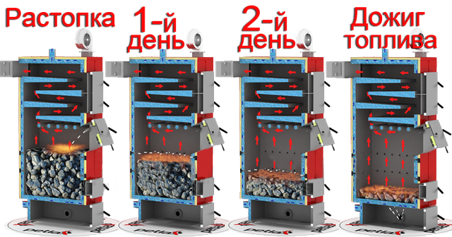 Розмір топки котла дозволяє працювати до 2-х діб на одному завантаженні палива (дана характеристика може зміняться в діапазоні 12 — 50 годин, залежно від виду палива і теплофізичних властивостей будівлі);