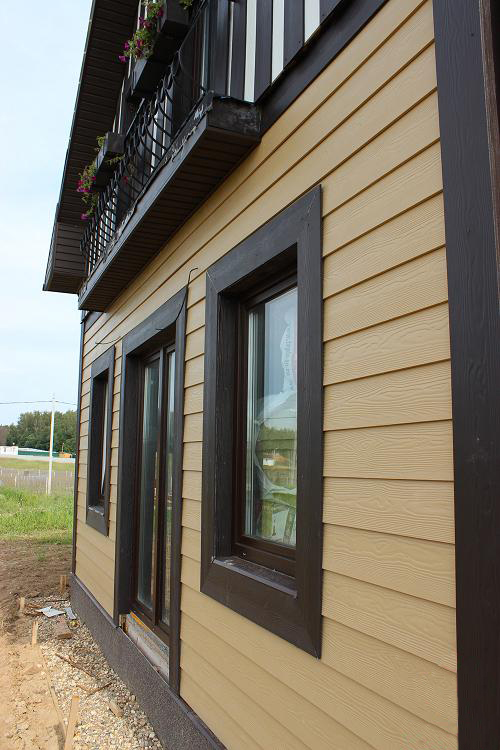 Натуральний вигляд. Котедж, облицьований фіброцементним сайдингом, має природний шляхетний фасад. Кольори та текстури фібросайдингу дуже добре імітують натуральні породи дерева. При цьому, на відміну від ПВХ сайдингу та металосайдингу, фасад виглядає тепло та натурально;Лицьова поверхня фіброцементного сайдингу покрита акриловими лакофарбовими матеріалами. Зворотний бік сайдинг-панелей фарбується захисним складом, що перешкоджає проникненню води в структуру панелі.