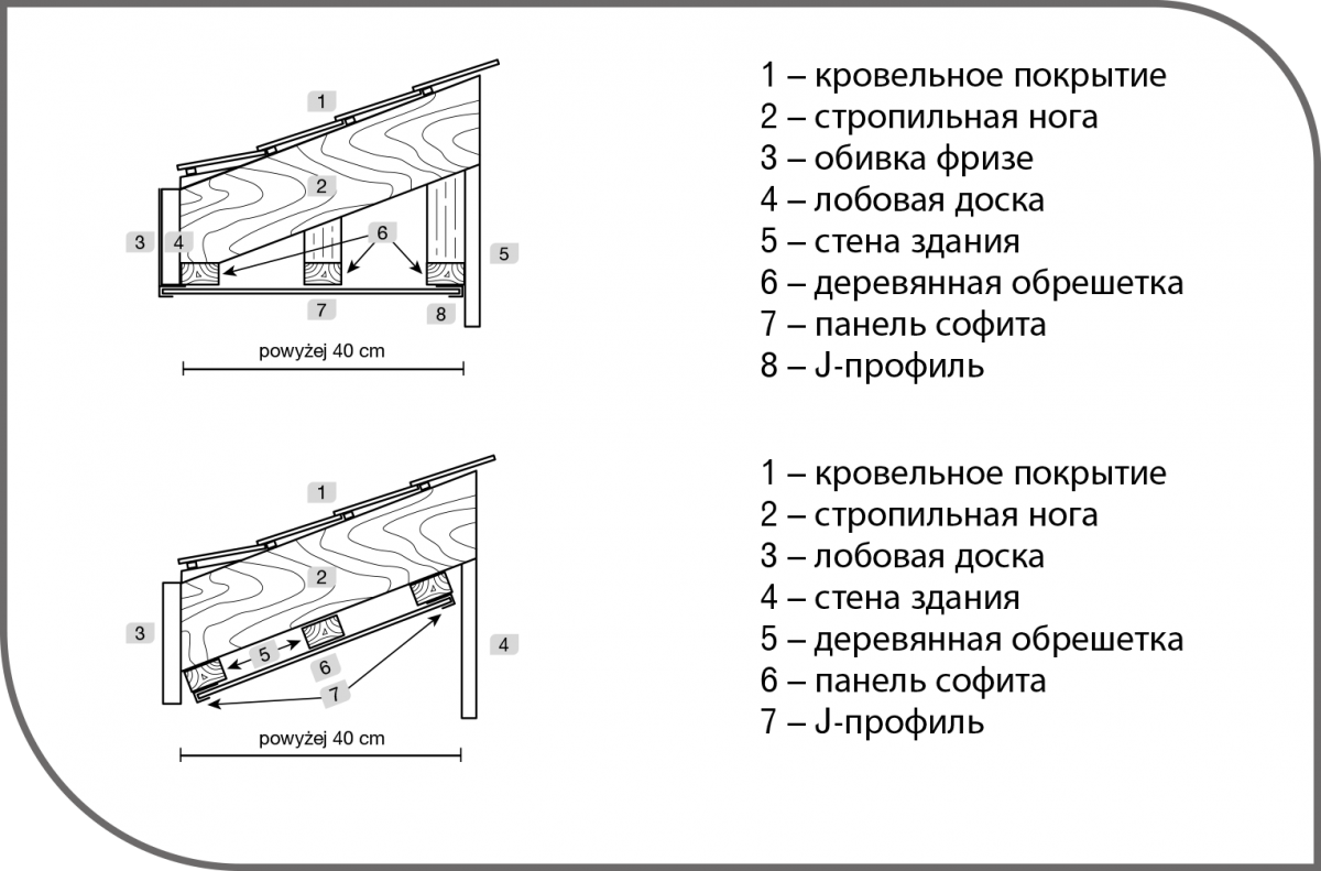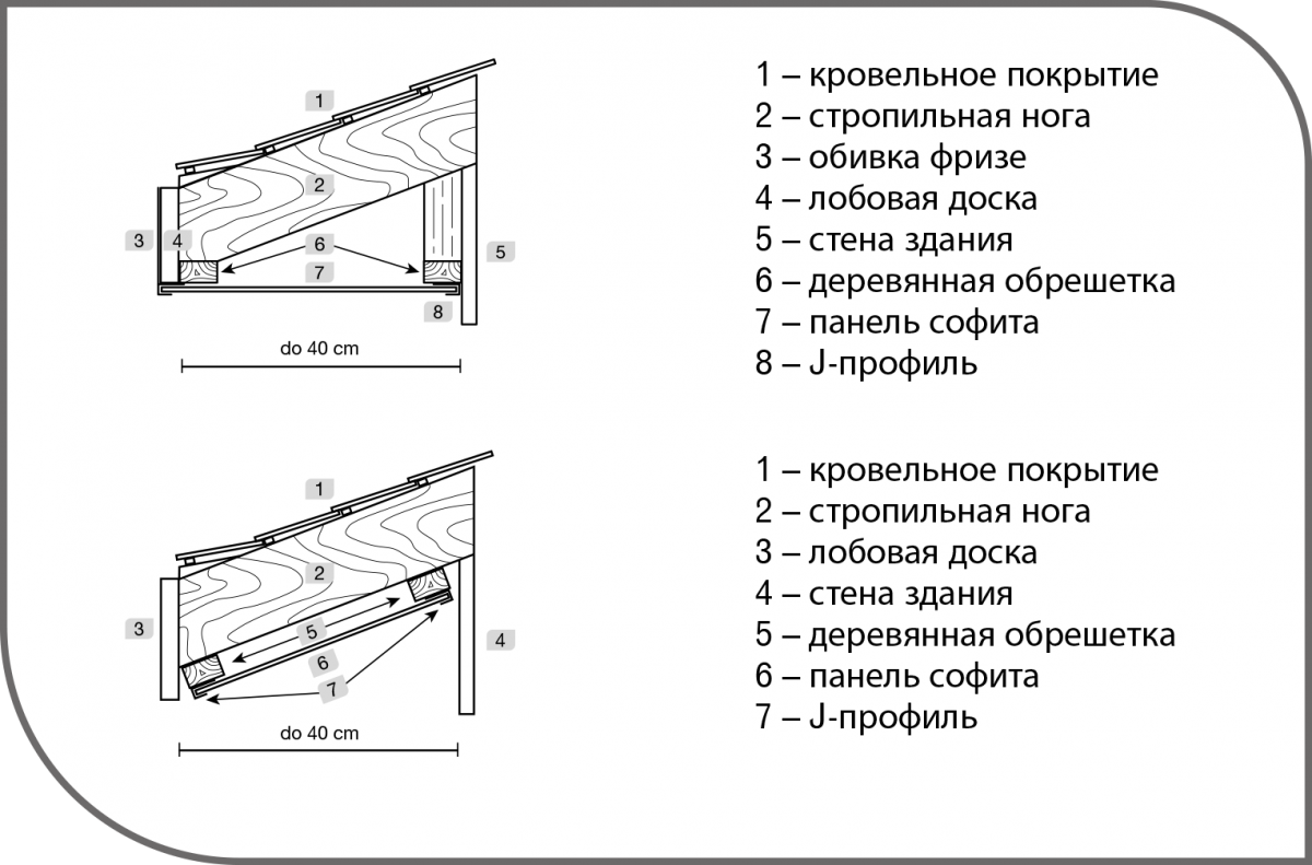 Підрізані на відповідну ширину панелі софіту всуваються у встановлені J-профілі перпендикулярно фасаду. Наступну панель слід вставити та зачепити замком за замок попередньої панелі;