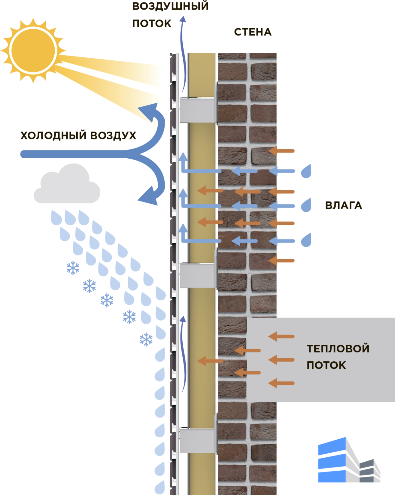 Невентелювані фасади. Під час експлуатації будинку у стінах накопичується волога. Це відбувається як зсередини, через випаровування в процесі життєдіяльності людини, так і зовні, внаслідок атмосферних опадів. В результаті теплопровідність стін збільшується, а утеплювач псується та втрачає свої властивості. Це спричиняє збільшення енерговитрат на опалення будинку взимку та охолодження влітку вже через 2 роки, а іноді й раніше.