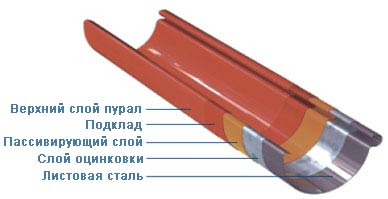 Сировина. Водостічна система Galeco STAL 150 виготовлена з високоякісної сталі. Високу стійкість жерсті додатково забезпечують 4 захисні шари, що оберігають від негативного впливу атмосферних факторів. Товщина сталевої основи становить 0,6 (мм). З двох сторін вона покрита шаром оцинковки, пасивуючим шаром, а також захисною та естетичною органічною оболонкою.