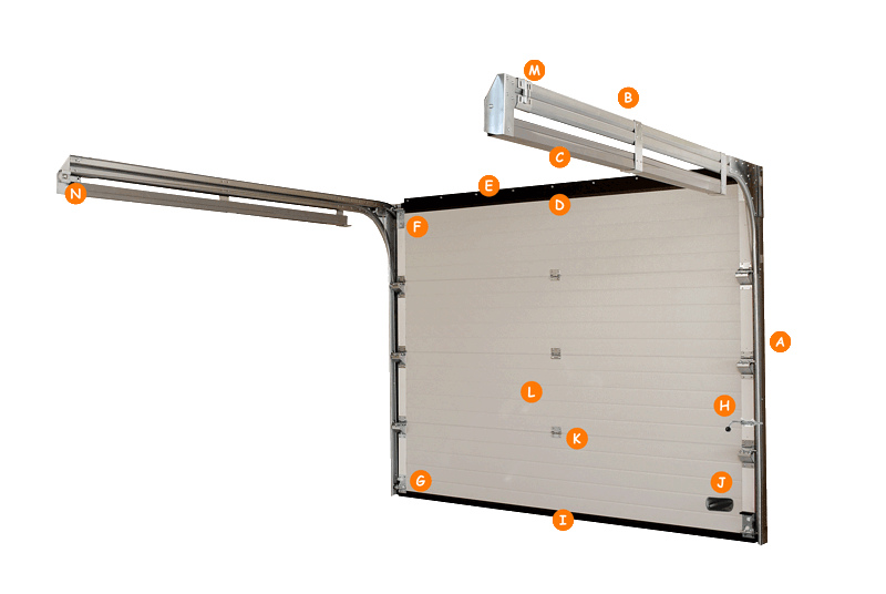 | L | Секція. Секція — це сендвіч-панель, що є багатошаровою конструкцією зі спіненого поліуретану (всередині) і металу (зовні). Метал має спеціальне антикорозійне покриття. Завдяки високій щільності поліуретану та гарній спекальності його з металом виходить досить жорстка та тепла конструкція. Набір секцій складає полотно воріт. |
