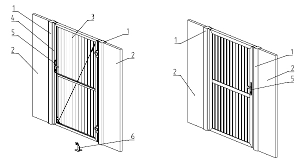 ![]() | 1. Стовп отвору; 2. Забор; 3. Стулка хвіртки; 4. Стовп притвору; 5. Комплект натискного гарнітуру; 6. Упор бічний. |