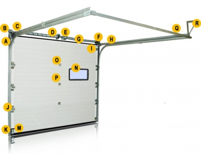 | Р | Секція. Секція являє собою або раму з алюмінієвого профілю з пластиковими склопакетами, або сендвіч-панель, що є багатошаровою конструкцією зі спіненого поліуретану (всередині) і металу (зовні). Метал має спеціальне антикорозійне покриття. Завдяки високій щільності поліуретану та гарній спекальності його з металом виходить досить жорстка та тепла конструкція. Це дозволяє виготовляти з сендвіч-панелей ворота до 7 м завширшки і використовувати їх у опалюваних гаражах. Набір секцій складає полотно промислових воріт. |