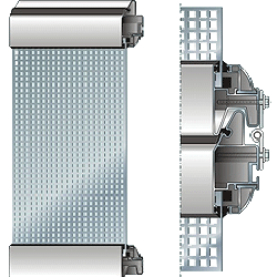 Перфорована панель. Панелі воріт складаються з алюмінієвої рами 40 (мм) ширини, в яку вставлено лист перфорованої сталі. Стандартний колір — анодований алюміній, проте є можливість пофарбувати ворота будь-якого кольору за таблицею RAL. | ![]() |
