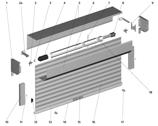 Рольставні з пружинно-інерційним механізмом: 1. Кришка бічна; | Рольставні з електроприводом: 1. Кришка бічна; |