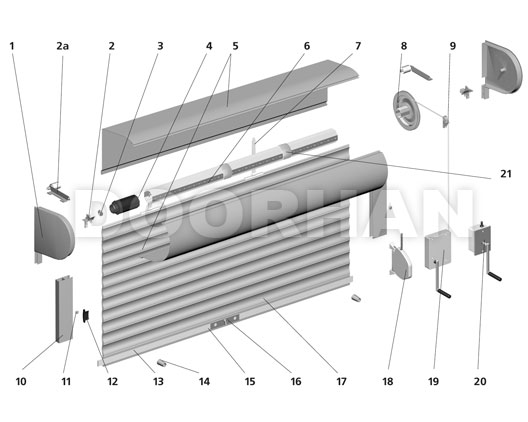 Рольставні з стрічковим, шнуровим та кордовим приводами: 1. Кришка бічна; | Рольставні з воротковим приводом: 1. Кришка бічна; |